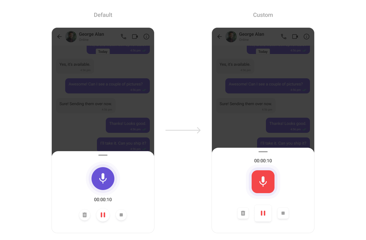 TheCometChatMediaRecorder Component facilitates the recording of audio and video messages. It supports full customization of its recording controls, including button sizes, shapes, and colors, making it an integral part of your media-rich chat experience.