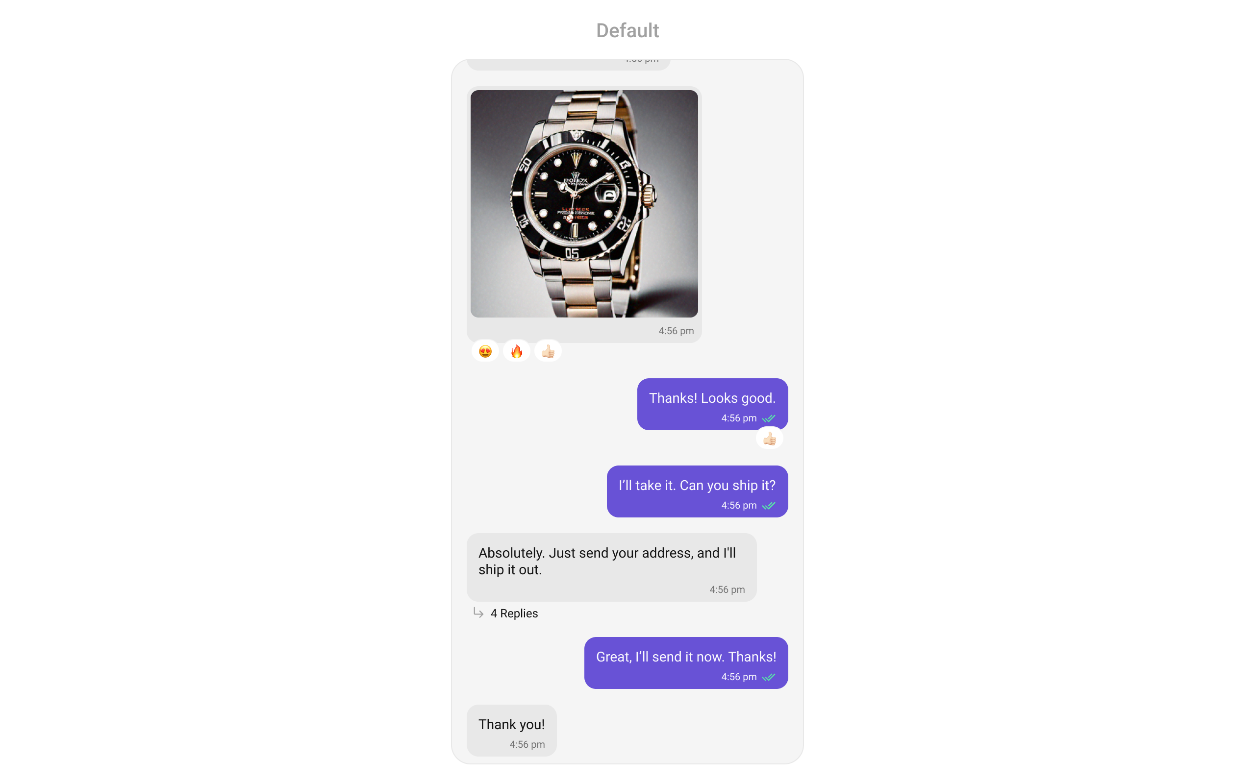 onThreadRepliesClick is triggered when you click on the threaded message bubble. The onThreadRepliesClick action doesn’t have a predefined behavior. You can override this action using the following code snippet.